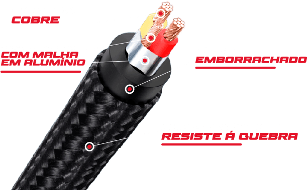• Conexão: conexão RCA com cabeamento emborrachado + malha resistente á quebra, 100% cobre e dupla blindagem de 6 metros.